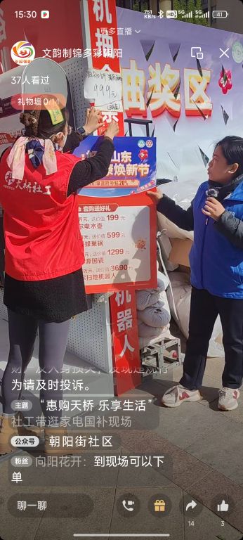 在国家持续高度关注民生,不断加大扶持力度的大背景下,家电国补政策应运而生,给广大居民带来了看得见、摸得着的实惠。近日,天桥区制锦市街道社工站携手朝阳街社区创新推出“惠购天桥 乐享生活”社工带逛家电国补直播专场活动,通过社工专业带逛的形式,为居民打造了一场沉浸式的云端购物体验。