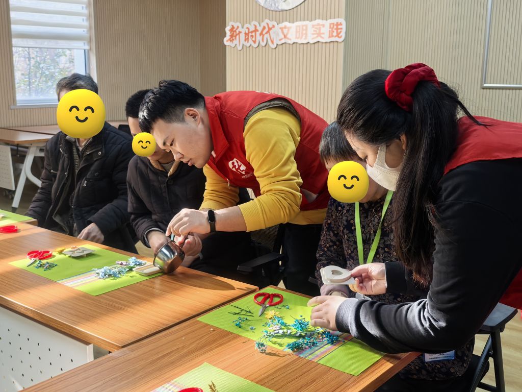在活动现场,社工与志愿者们通力合作,为残疾人朋友营造了一个充满温馨且无障碍的创作环境。社工详细讲解了蜡牌制作的流程,从蜡的熔化到造型设计,每一个环节都进行了详尽的示范。在制作过程中,社工始终在旁密切关注,适时给予协助引导。当残疾人朋友在调配蜡液颜色遇到困难时,社工耐心地提供技术支持与建议;在小组讨论创意方向陷入僵局时,社工巧妙地启发思路,鼓励大家积极表达观点,促进成员间的交流互动。残疾人士积极参与,他们以小组形式分工合作,有的负责调配蜡液颜色,有的精心挑选干花装饰,充分展现了他们的想象力与创造力。