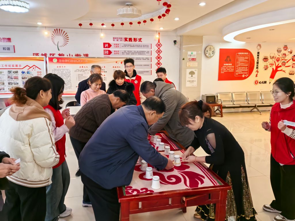 为了丰富老年人的业余生活,增进他们的身心健康。12月11日上午,鲍山街道社工站联合山东青年政治学院青爱晚养老协会志愿者,于鲍山街道综合养老服务中心成功开展“乐享晚年,智趣同行”——老年人趣味活动之‘筷’夹纸杯游戏。本次活动旨在通过简单有趣的互动游戏,锻炼老年人的手眼协调能力和身体灵活性,同时促进他们之间的交流与合作,营造欢乐和谐的氛围。