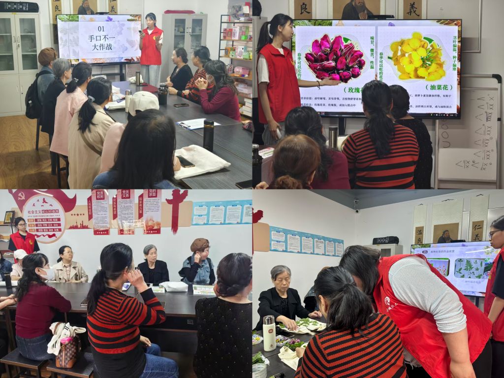 活动伊始,社工和志愿者引导居民通过“手口不一大作战”破冰游戏迅速建立信任关系。在“春天识认认”环节,志愿者结合实物标本与动态PPT,采用参与式教育方法,系统讲解油菜花、玫瑰花等6种本土植物的生态特征及文化寓意,特别延伸讲解《诗经》中“桃之夭夭”等植物意象,将生物知识与文化传承有机融合。