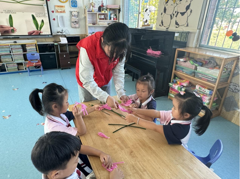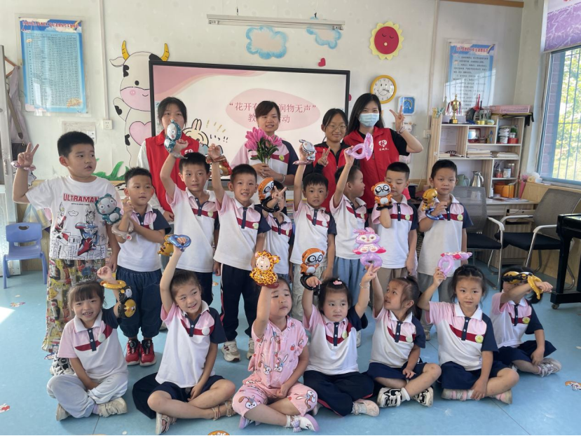 紧接着是“花”满校园——扭扭棒手工游戏。这个游戏培养儿童动手能力,还让他们在紧张刺激的氛围中感受到了团队合作的乐趣。此项活动结束后,孩子们纷纷将自己制作的花送给老师。最后,孩子们纷纷带上动物手环,跟着歌曲挥动双手,跟唱歌曲,用稚嫩的歌声向老师表达感激之情。老师们也跟着歌曲感受着孩子们对自己的感激。