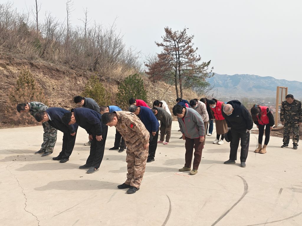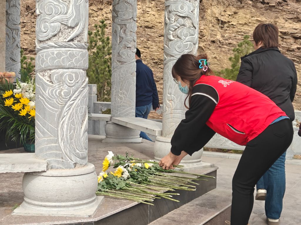 活动在庄严肃穆的氛围中拉开序幕。常庄村党支部段书记作开场致辞,他带领大家回顾了崮顶山烈士纪念碑的历史背景,讲述了革命先烈为民族解放事业英勇献身的感人事迹,号召全体人员铭记先烈功绩,传承红色基因,以实际行动践行新时代使命担当。随后,工作人员为革命烈士敬献花篮,表达对英烈的崇高敬意。社工组织现场群众有序上前,逐一将手中寄托哀思的鲜花轻轻摆放在纪念碑基座前,缓步绕行瞻仰烈士墓,黄白菊与翠柏相映,象征着先烈精神永垂不朽,革命薪火代代相传。活动最后,全体人员面向烈士纪念碑庄严肃立,行三鞠躬礼,以简朴而隆重的仪式向英烈致以深切悼念。
