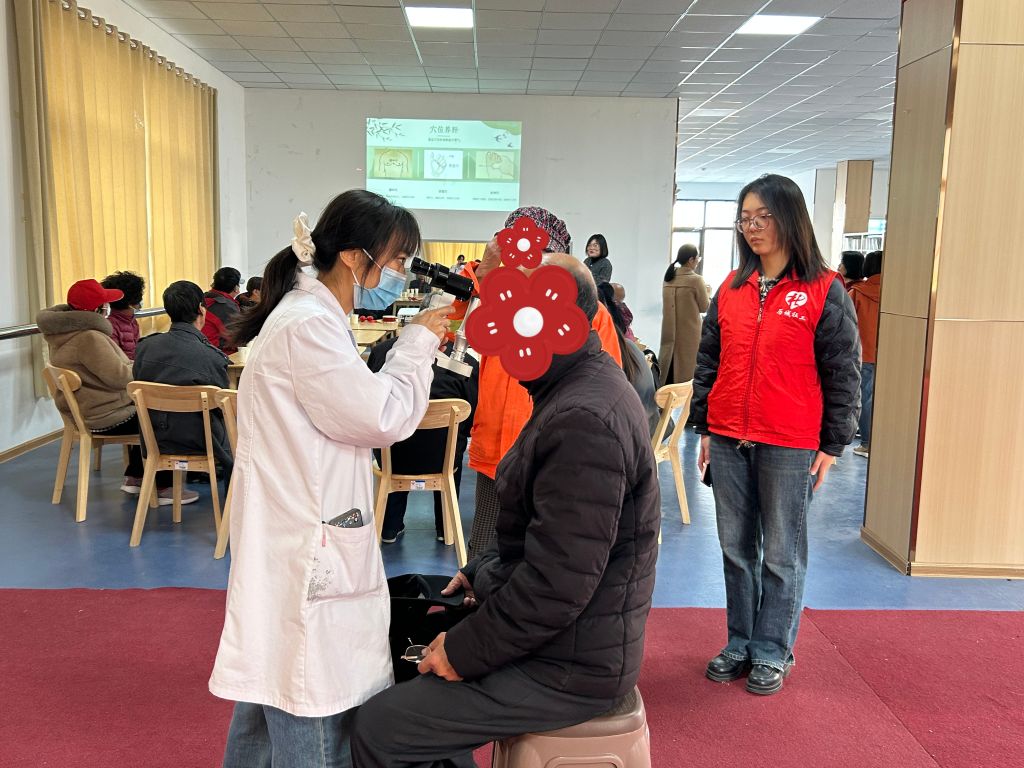 心理团体辅导活动结束后,社工站邀请山东中医药大学附属眼科医院的眼科专家,为计生特殊家庭开展白内障筛查诊断。专家们携带专业的眼科检查设备,耐心细致地为每一位村民进行视力检测、裂隙灯检查等项目,为确保能够顺利完成各项检查,社工引导他们依次进行各项检查,全程进行陪同,确保整个筛查过程有序进行。