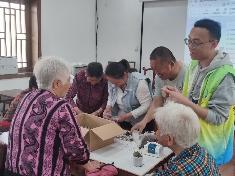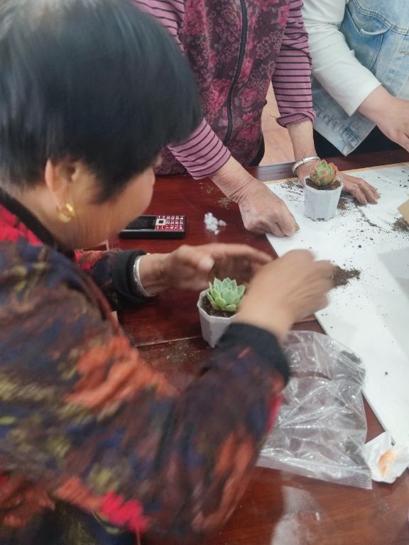 在多肉植物饱满的叶片中,藏着生命的坚韧与从容;在它们缓慢生长的节奏里,映照着人生的沉淀与绽放。通过亲手培育一株多肉,在观察、照料与陪伴中,共同探索生命教育的深刻启示。近日,孙耿街道社工站开展“嗨翻银龄”第三节。本节小组旨在让老年组员在春日绿意中体验疗愈式社交、感悟生命启示,缓解晚年焦虑情绪。本次小组共计参与人数7人。