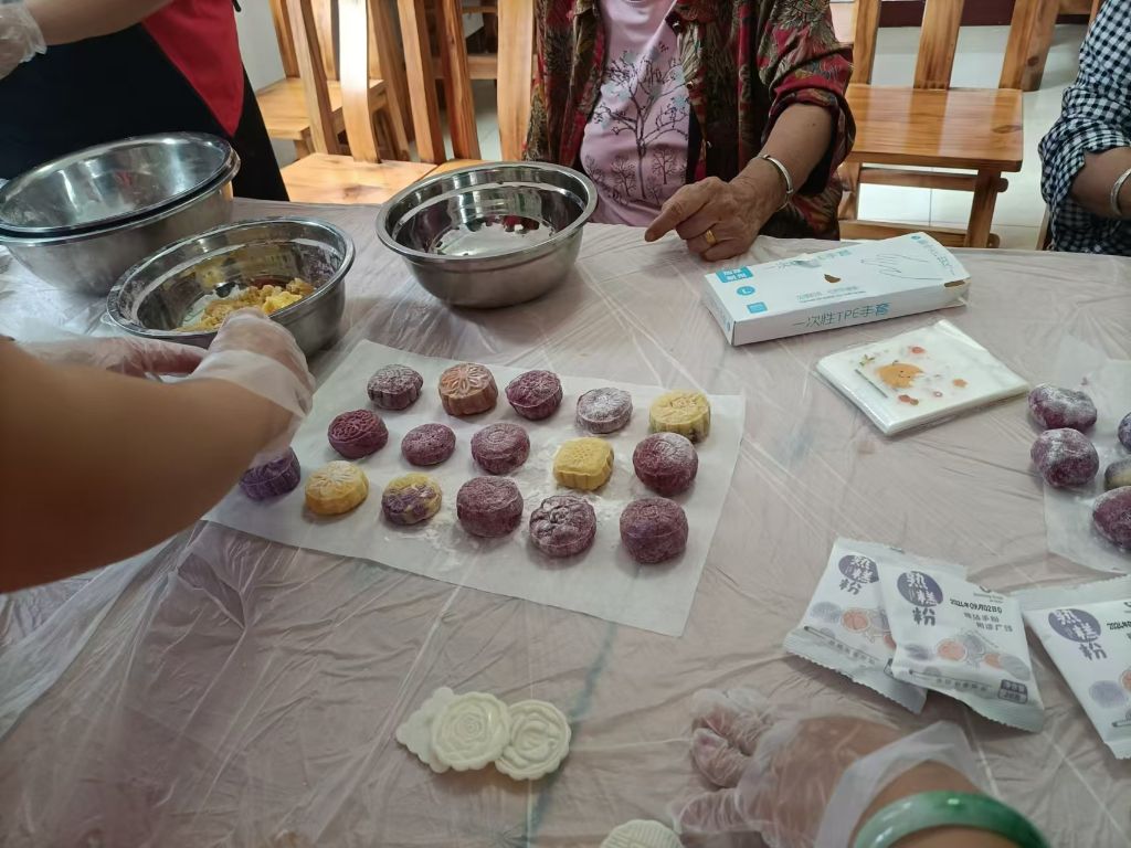 活动现场,社工人员向老人们详细介绍了制作月饼的步骤和技巧,并现场进行了示范。大家认真聆听,积极互动,纷纷对制作月饼充满了期待。他们按照志愿者的指导,有条不紊地烫面、揉面团、压冰皮、包馅料、压模、塑封,不一会儿,一个个象征着团圆与美好祝愿的月饼就呈现在大家眼前,大家脸上洋溢着满满的成就感。整个制作过程中,老人们积极参与,互相帮助,现场氛围温馨而欢乐。活动结束后,社工人员又走访慰问了高龄老人和特困老人,为其送上暖心的节日祝福与月饼、大米、油等慰问品。