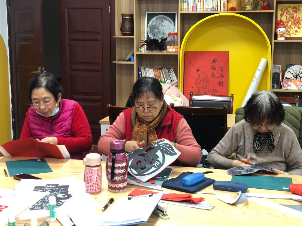 在练习裁剪贺岁剪纸环节,组员们互动性显著提高,自行形成小组,就如何裁剪太阳纹、月牙纹、锯齿纹、水滴纹、柳叶纹等技巧展开热烈讨论。同时骨干组员王老师也发挥了积极作用,主动帮助有困难的组员解决问题,形成了良好的互助网络,并协助组员们完成了突破自我设限的目标。