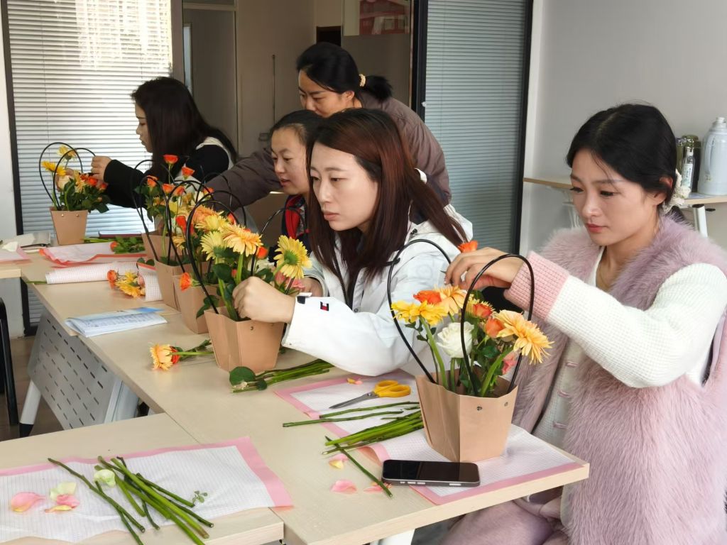 活动伊始,社工向社区工作人员介绍本次工作坊的目的与内容。随后,在专业花艺师的指导下,社区工作人员们投入到花艺沙龙之中,开始了插花创作。从修剪枝条到选配合适的花材,社区工作人员们都积极主动地投入到每一步的操作中。过程中,花艺师细致耐心地进行指导,帮助他们克服难点,直至作品完成。花艺沙龙,不仅为社区工作人员们提供了一个放松心情的机会,更通过艺术创作让大家体会到心灵的疗愈与情感的交流。