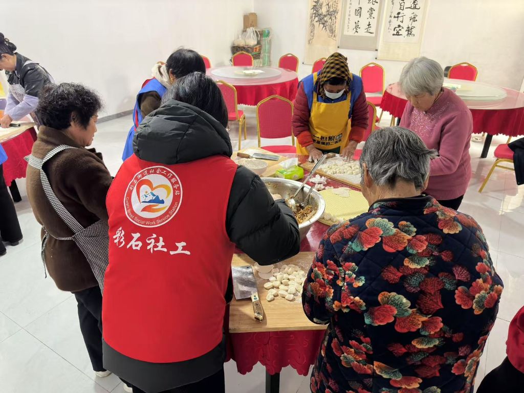 在活动场地的一角,还传来阵阵欢声笑语。原来,社工们和老人们一起围坐在一起包水饺。大家分工明确,有的和面,有的擀皮,有的包馅,现场一片热闹景象。老人们一边熟练地包着水饺,一边分享着自己年轻时包水饺的趣事,社工们则认真倾听,不时插话交流,现场气氛温馨而融洽。不一会儿,一个个形态各异的水饺便摆满了桌面。随后,大家一起将包好的水饺下锅煮熟,热气腾腾的水饺端上桌,老人们品尝着自己亲手包的水饺,脸上洋溢着幸福的笑容,这不仅是一顿简单的午餐,更是一份浓浓的温情与关爱。