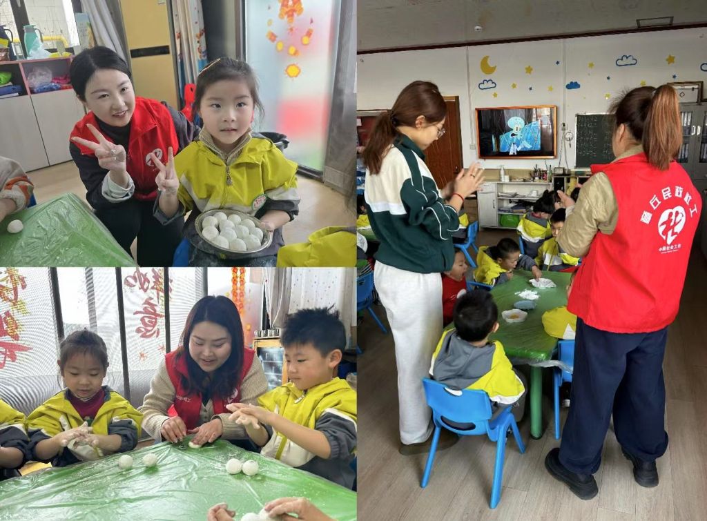 大家纷纷挽袖子、揉面团、搓汤圆,小朋友们也跃跃欲试。尽管动手包汤圆过程中遇到了种种问题,“我包的有点小哎”“我的这个馅儿料包不上了哈哈哈”但孩子们玩的不亦乐乎。在社工的耐心指导下,孩子们依然充满热情地尝试着,并且越包越熟练。活动现场充满了欢声笑语,社工们鼓励孩子们展示自己亲手包的汤圆,小朋友都开心的举起手中汤圆,自豪地说:“阿姨,看!我包的汤圆又大又圆。”经过社工和孩子们的共同努力,盘子里装满了圆滚滚汤圆。