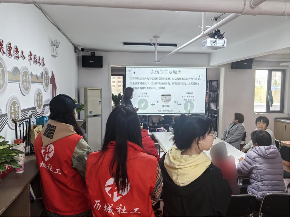 小组伊始,志愿者进行自我介绍并带领组员们通过“纸杯叠叠乐”的方式进行简单破冰,组员积极参与的热情调动了整体愉快的小组氛围,营造了良好团队气氛,缓解了成员压力。接下来,志愿者为组员讲解冬天防寒保暖的重要性以及如何防寒保暖的相关知识,老人听得十分认真。通俗易懂的语言加上PPT图片展示的形式,使组员不仅详细了解了防寒保暖的相关知识,也增强了老人防寒保暖意识,有助于组员提高冬季生活安全意识,保障了老人健康和安全。