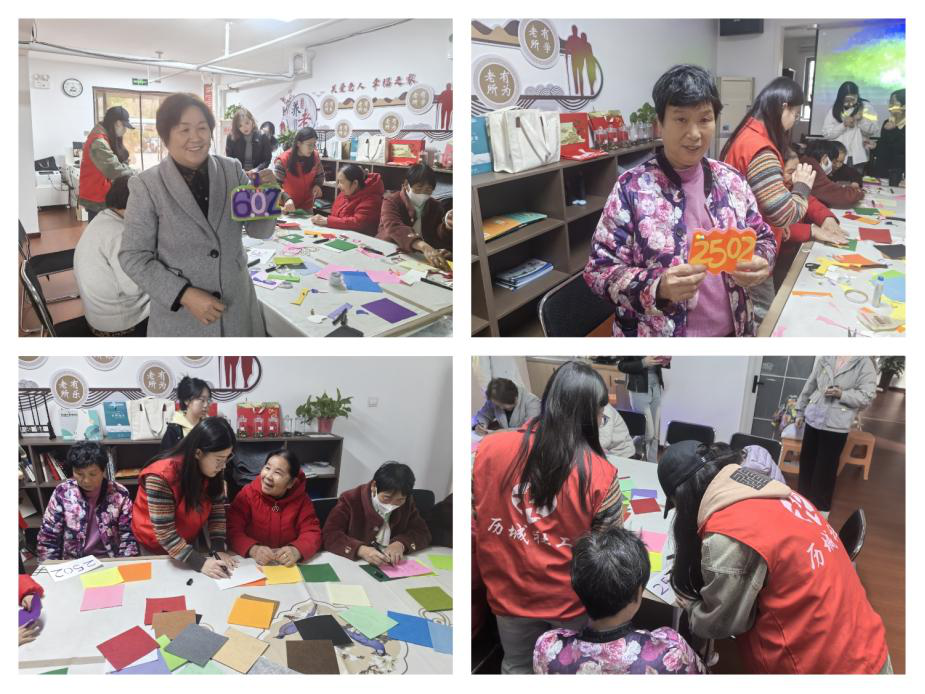 最后的活动环节是用不织布材料进行手工制作门牌。活动过程中,志愿者进行制作技巧讲解和演示,组员在社工的指导下开始门牌号的制作,期间社工不仅帮助组员解决制作遇到的困难,还组织组员进行作品展示和心得分享。手工游戏不仅能够增强组员的社交能力和自信心,在手工制作过程中,组员可以与其他参与者交流心得,分享经验,增强彼此之间的互动和友谊。