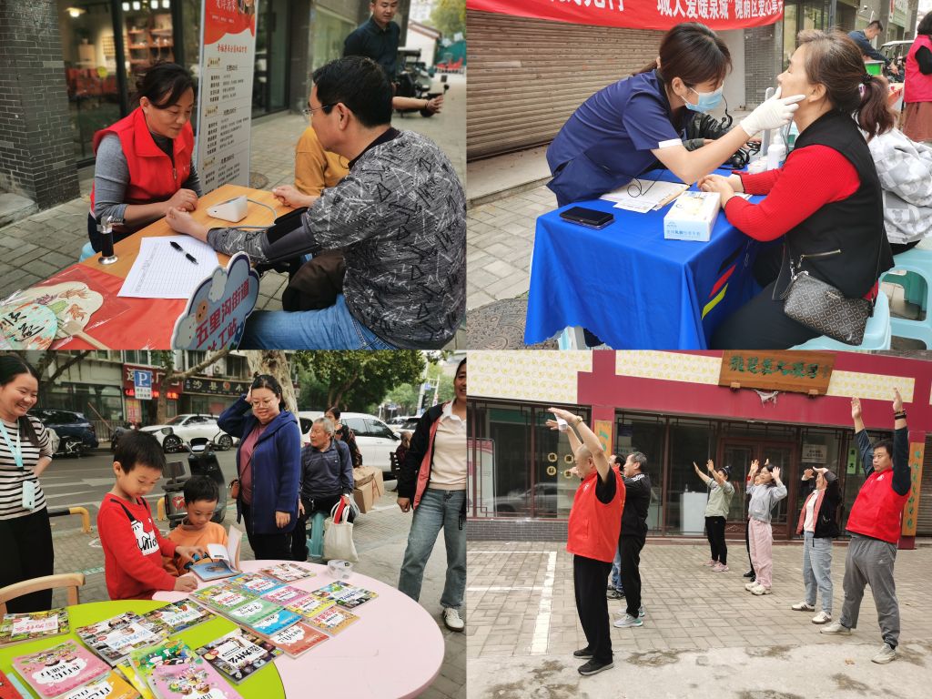 活动现场,专门设立的健康检测区域人潮涌动,医护志愿者耐心细致地为老人们量血压、测血糖,并进行心肺功能等基础检查,并且会根据老人的身体状况给予专业的健康建议,还不忘叮嘱其日常饮食和锻炼的注意事项。中医养生区,志愿者们带领居民进行八段锦的学习,随着优美舒缓的乐曲,他们的动作柔和舒缓,神情专注,潜心习练。在共享阅读摊位前,老年人和儿童围坐在一起,共同打开一本本充满智慧与情感的书籍,老人们用沉稳而慈祥的声音,逐字逐句地为身旁的孩子朗读着故事,遇到孩子不懂的字词,便耐心地解释。孩子们听得津津有味,不时提出一些充满童趣的问题,老人们都微笑着一一解答。