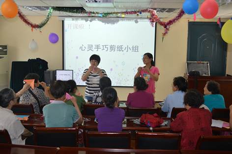2015年6月11日下午,十亩园项目组组织社区空巢老年人开展“心灵手巧”剪纸活动。