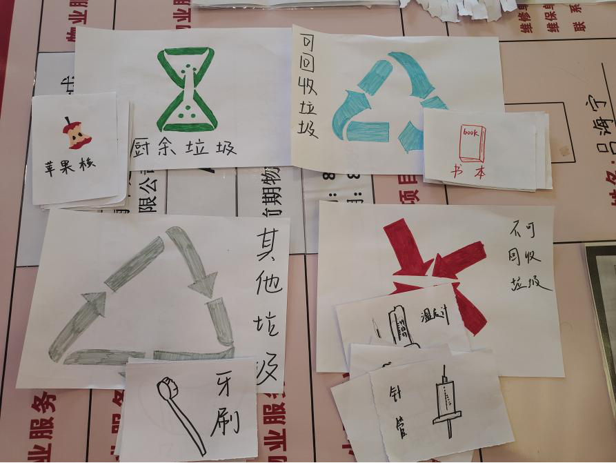 最后一期活动以环保为主题。志愿者通过设计与主题相关的游戏,增强小朋友们对于环境保护的热爱,提高自觉保护环境的意识。志愿者提前准备不同垃圾回收桶和各种垃圾的卡片,让小朋友将各种垃圾投入到相应的垃圾桶里,‘环保卡片’游戏不仅锻炼孩子的沟通协作能力,还能够增强垃圾分类保护环境的意识。接着,‘环保绘画接龙’游戏是通过绘画的方式,让小朋友接力画出有关环保的人或物,来帮助其理解环保的重要性。