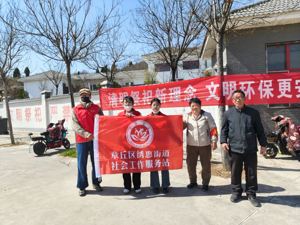 志愿行动,平安护清明。社工联合志愿者对辖区墓地、山林等公共场所,开展了一系列志愿服务活动。社工不仅为前来祭扫的居民提供引导服务,讲解文明祭扫的注意事项,而且及时劝阻不文明焚烧行为,以实际行动践行绿色追思的理念。
