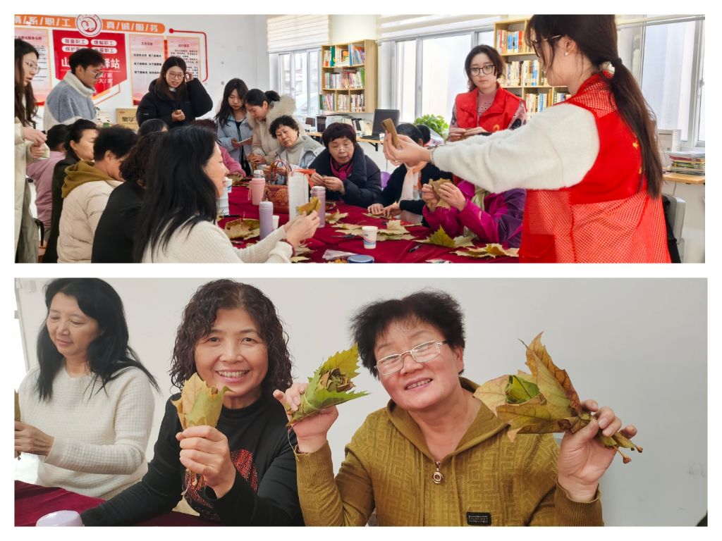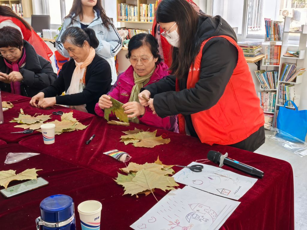 最后的活动环节是用梧桐树叶制作玫瑰花束。活动过程中,志愿者进行制作技巧讲解和演示,组员在社工和志愿者的耐心指导下开始树叶花束的制作。期间社工不仅帮助组员解决制作遇到的困难,还组织组员进行作品展示和心得分享。手工环节——梧桐花束制作不仅能锻炼老年人手部精细动作,利于保持手部灵活性,而且也有利于老人可发挥想象力与创造力。