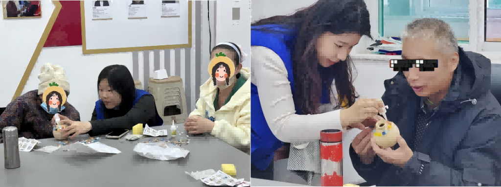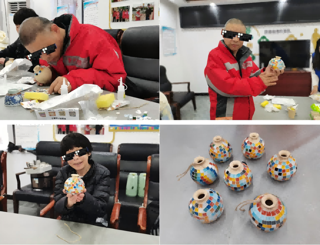 随后,进入备受期待的“将春天装进花瓶里”的马赛克花瓶创作环节。五颜六色的马赛克花瓶 DIY 材料包整齐地摆放在桌上,仿佛在向服务对象发出创作的邀请。社工鼓励服务对象们以春天为主题,尽情发挥想象力,构思花瓶的图案样式。一时间,大家纷纷沉浸在创作的世界里。有的服务对象手托下巴,眼神专注地盯着材料包,似乎在脑海中勾勒着一幅美丽的春日画卷;有的则迫不及待地拿起彩色碎片,在手中比划着,尝试不同的组合方式。
