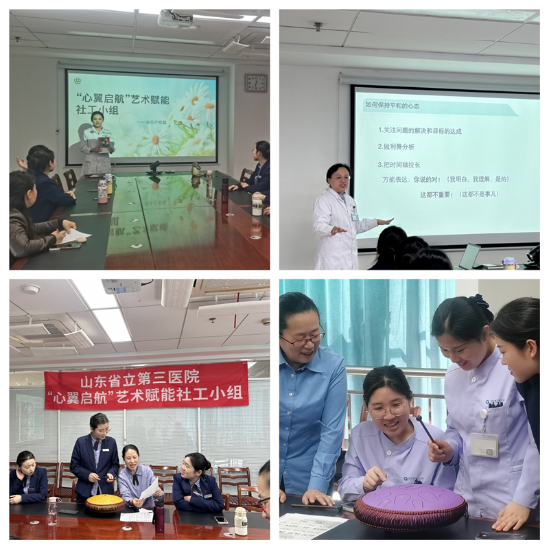 活动由山东建筑大学社会工作专业研究生张怡然(实习)与省立三院高级社工师张玉共同主持。在五期活动中,紧扣沟通能力与心理素养提升主题,巧妙融合音乐、绘画、视觉、律动、非遗手工艺等五种艺术形式。活动过程中,导医和运送员们在轻松愉悦的氛围里,学习了非暴力沟通技巧、情绪管理方法以及幸福指数曲线等实用知识。例如,在曼陀罗绘画环节,社工运用专业方法引导参与者通过色彩表达内心情绪,并结合情绪管理知识进行疏导;音乐律动环节让大家深刻体会到音乐节奏与情感传递的紧密联系。这些知识既有趣味性又具实用性,切实帮助工作人员缓解了日常工作压力,增强了心理韧性。