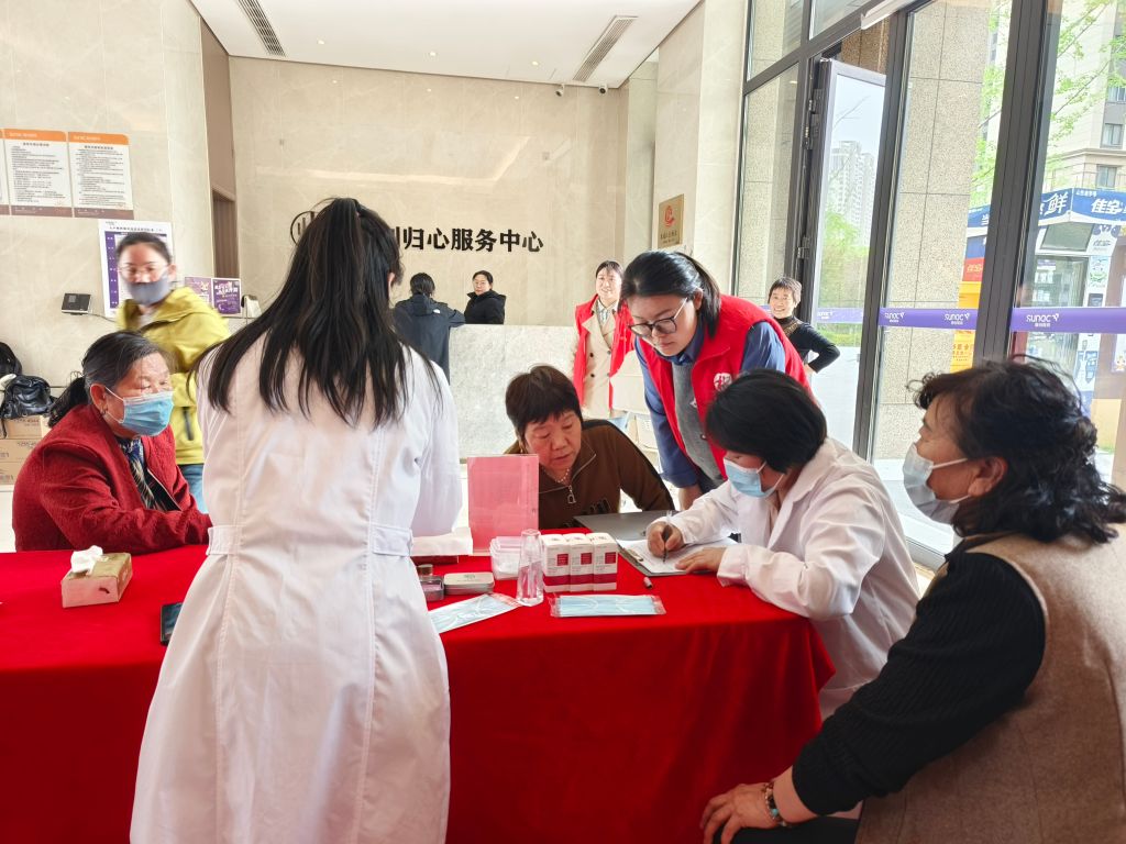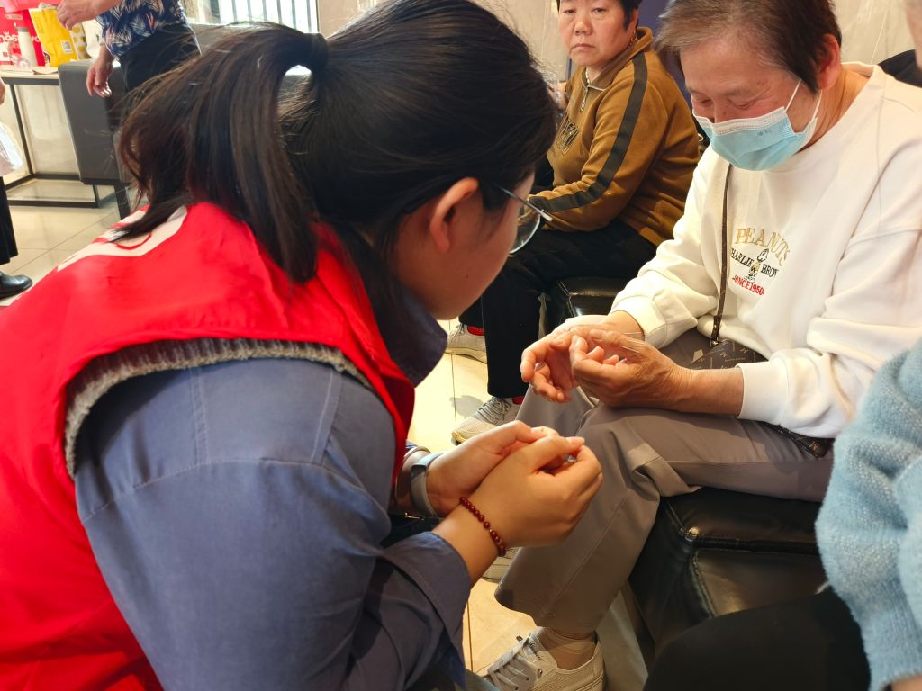 活动当天,社工和志愿者医师早早抵达活动场地进行布置,活动现场设置了血压血糖测量区、针灸体验区、眼部保健区等等,中医大夫针对中老年群体高发的风湿关节痛、失眠及"三高"问题进行专项诊疗,社工从旁为居民建立健康档案。志愿者医师通过"望闻问切"的中医特色诊疗模式,耐心询问居民的日常饮食、生活习惯和过往病史,根据检查结果,为居民制定个性化调理方案,内容涉及饮食调整、运动锻炼、定期复查等多个方面。手关节痛的项阿姨针灸完说道:“把针一拔,感觉手指头都灵活了,没那么疼了。”