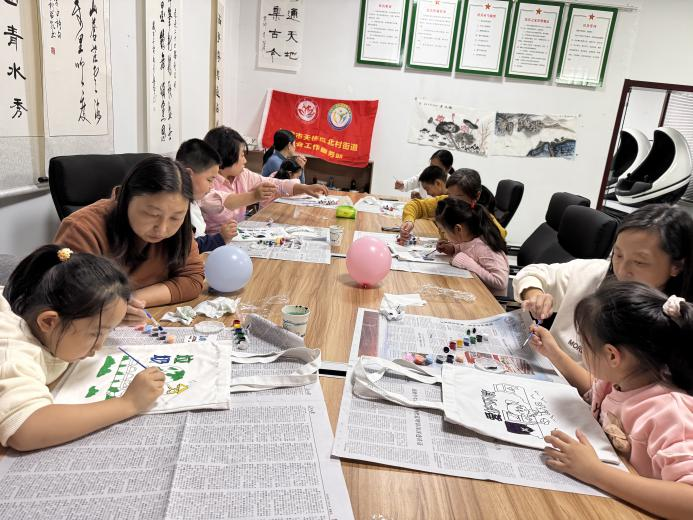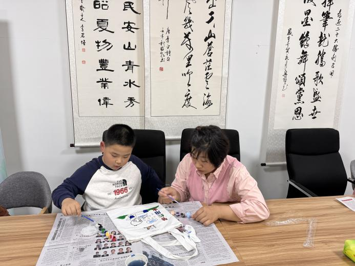 “比划猜词”环节结束后,大家稍作休息,便迎来了本次活动的第二个精彩环节 —— 手工帆布包制作。社工们为每个家庭分发了制作帆布包所需的材料,包括洁白的帆布包、色彩鲜艳的颜料、粗细不同的画笔。制作过程中,大家懂得了沟通的真谛,亲子间的互动温馨而美好,面对绘制帆布包的困难和分歧,他们通过良好的沟通一一解决,爱与理解在一笔一划中温情传递。