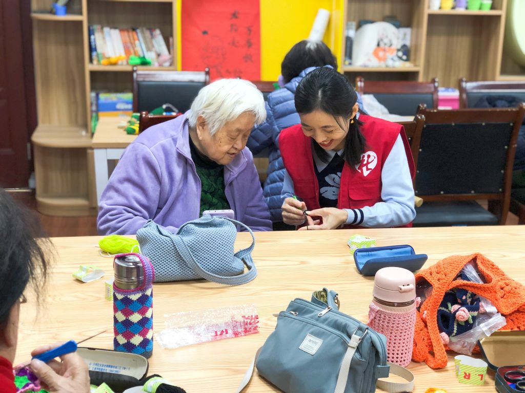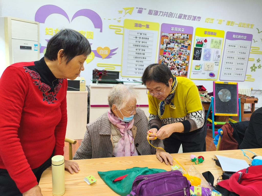 时间在穿针引线中慢慢流逝,组员们手中的作品逐渐成形。本节活动不仅引导组员们学习毛线编织的技巧,更让她们在互助交流中打破孤独,发现社交乐趣,满足朋辈支持需求。