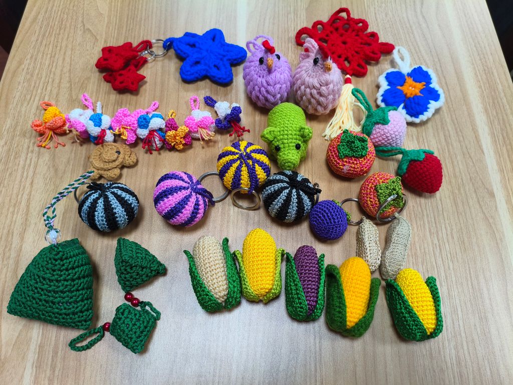 活动伊始,社工带领组员们回顾上节活动内容,并邀请大家带来编织好的作品,一一进行展示。组员们通过编织老师的指导,做出了各式各样的小物件:玉米、草莓、南瓜、茄子、花生、粽子等等,造型生动可爱,独具匠心。