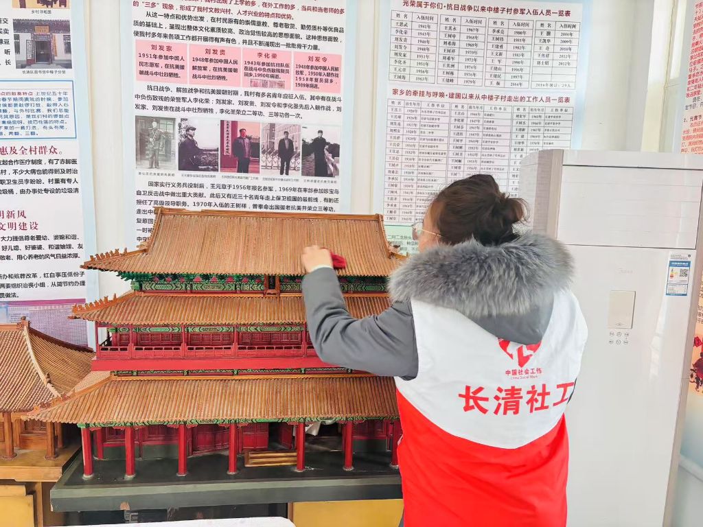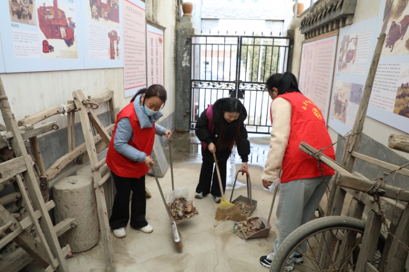 活动当天,社工们满怀热忱,早早集合在纪念馆门前。进入馆内,大家迅速分组行动,各自领取清洁工具。有的志愿者负责擦拭展柜,他们用柔软的抹布轻轻拂去灰尘,不放过任何一个角落,力求让展柜内的文物和资料清晰地呈现在参观者眼前;有的志愿者清扫地面,认真细致地将地面的杂物、灰尘清扫干净,随后又拿起拖把反复拖地,直至地面光亮照人 。
