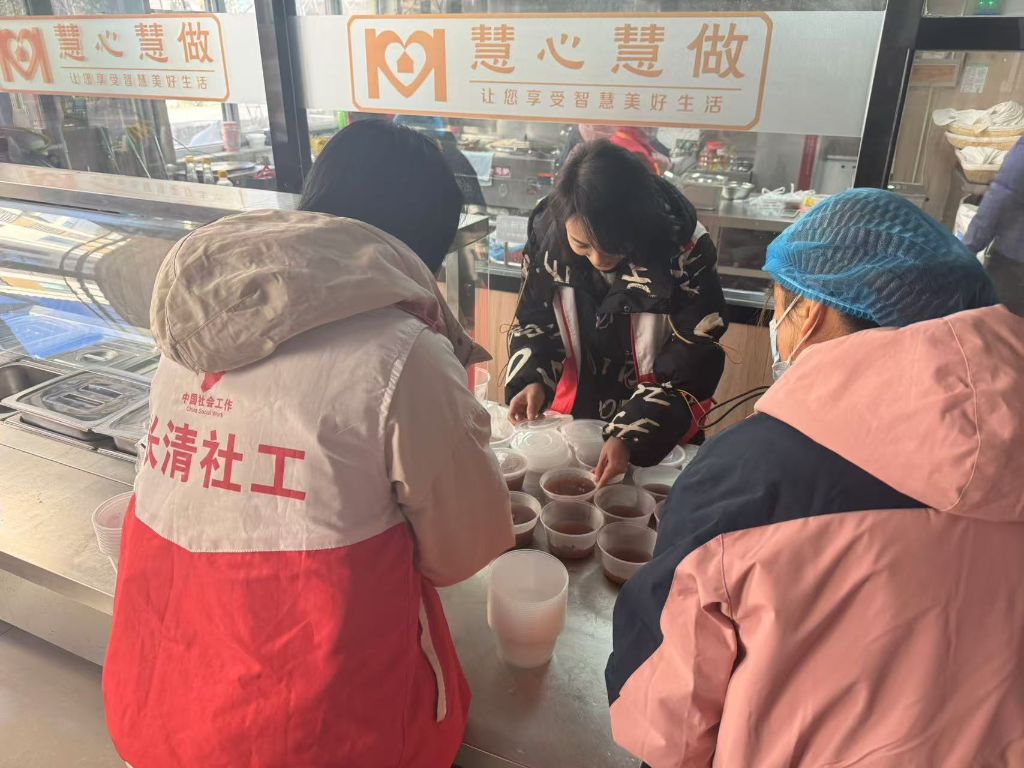 活动现场,社工提前准备好糯米、蜜枣、红豆、花生、莲子等材料,经过一两个小时的熬制和翻滚,香甜的腊八粥也出炉了,社工把刚出锅的腊八粥分装到碗里,将香浓软糯的腊八粥和“福”字送到环卫工人手上,一碗碗热气腾腾的腊八粥、一句句暖心的问候,让环卫工人感受到满满的温暖。他们一边唠家常,一边分享着生活琐事,每个人脸上都洋溢着幸福笑容,现场热热闹闹,充满温馨。王阿姨说到“不错不错,又香又甜,喝着腊八粥,心里暖暖的”。活动最后,社工为环卫工人发放了暖心包,暖心包里有帽子、手套等保暖物品,在给环卫工人送去别样温暖的同时,叮嘱环卫工人做好防寒保暖,保重身体,并向他们致以崇高敬意和衷心感谢。