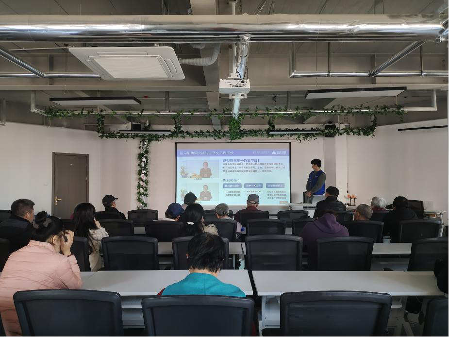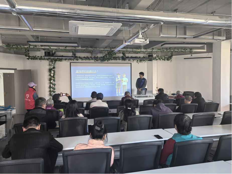 为了保护老年人群体的财产安全和合法权益,提升公众尤其是老年人的防骗意识和能力,维护社会和谐稳定, 3月20日,鲍山街道社工站联合蚂蚁公益基金会走进钢城新苑西区社区开展“蓝马甲公益行,共筑老年人防诈防线”公益课堂志愿服务活动。活动吸引近30 人参加。