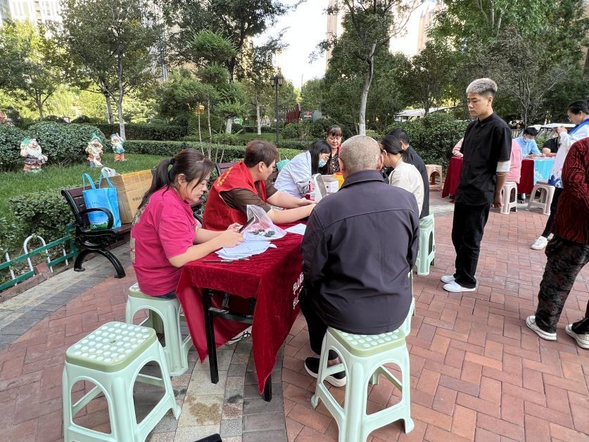 健康义诊区,医疗志愿者耐心地为居民测血压、量血糖,并根据居民的健康状况给予合理的建议和指导。
