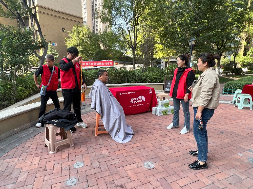 爱心理发区,理发师详细询问老人的需求,并按照老人的期望进行“私人订制”,看着修剪后心仪的发型,居民对理发师的技术称赞不绝。
