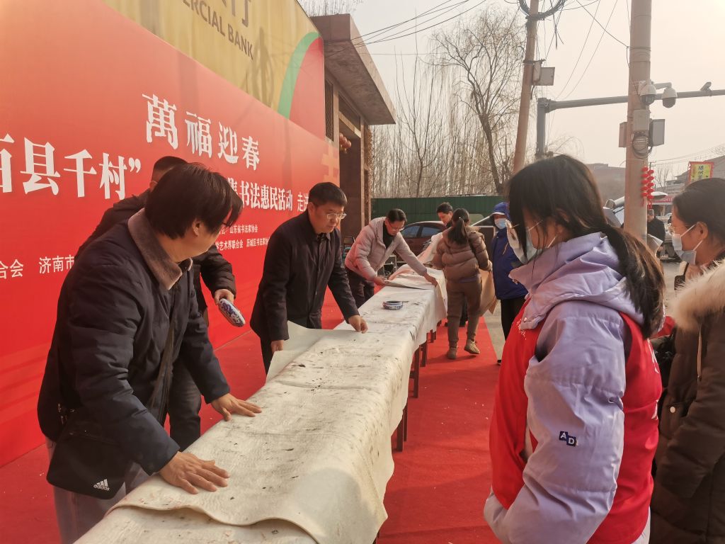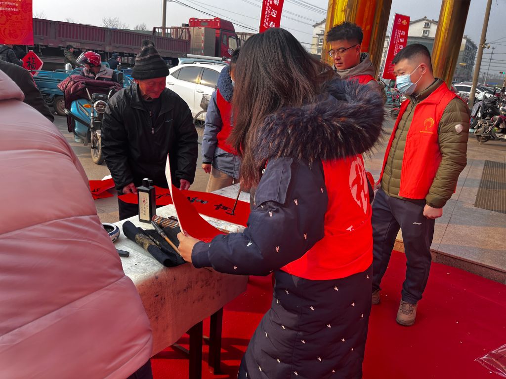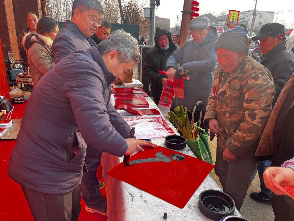 活动现场,大集上人头攒动,热闹非凡。在社工的精心组织和安排下,省文联的书法家们早早来到现场,他们个个精神饱满,神情专注。铺展红纸,蘸满浓墨,书法家们提起笔来,气韵流畅的毛笔字便跃然纸上。一幅幅充满祝福、赞美美好生活的春联在他们的笔下诞生,笔法精湛,寓意深远,赢得了现场居民们的阵阵赞叹。