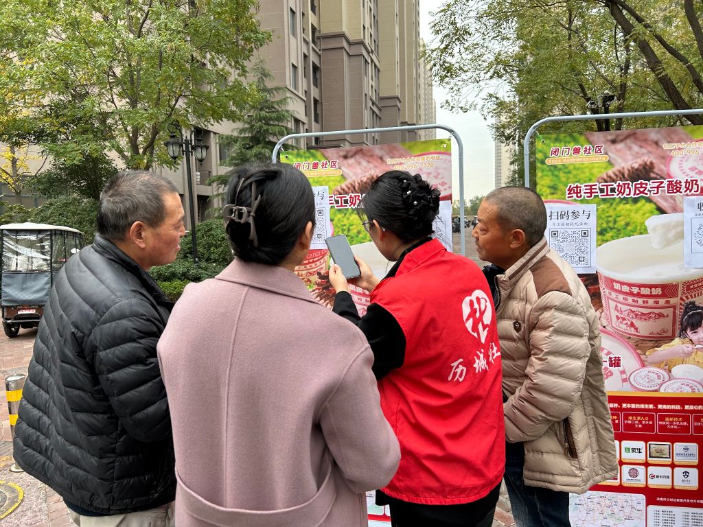 精品老酸奶摊位前,居民排起了长长的队伍,现场不仅可以免费领取一份,还可以以优惠的价格购买,社工耐心的帮不太擅长用手机的老年人扫码领取酸奶。