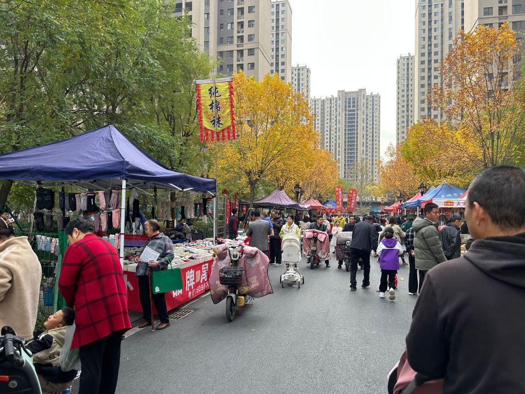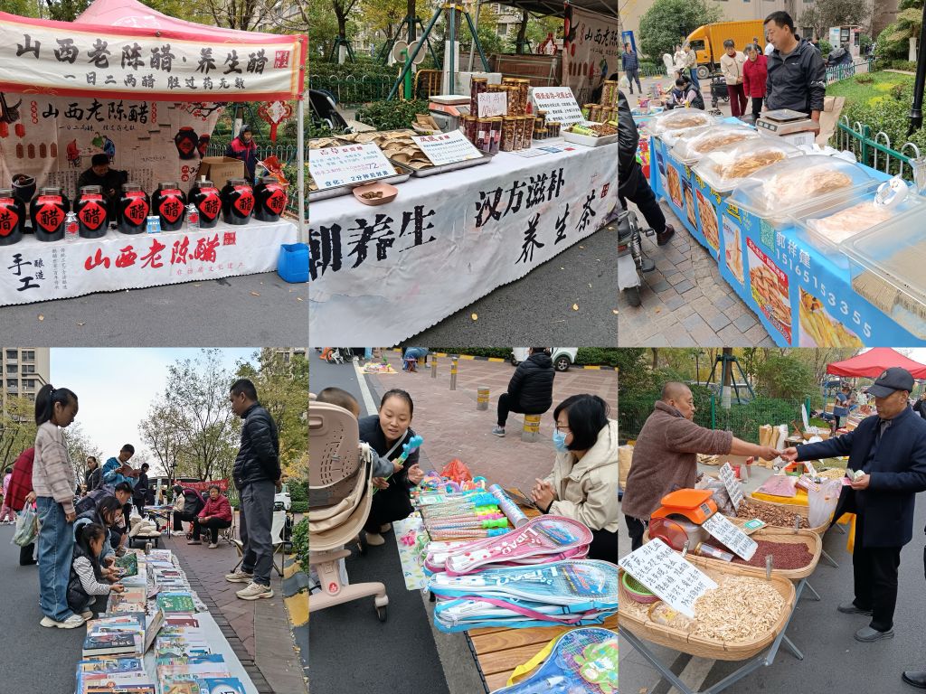 市集上,琳琅满目的商品,让人们目不暇接,既有传统的山西老陈醋、滋补的养生茶、软糯的的米面,也有美味的牛肉干、奶酪、烤鱼片等小吃,还有鞋袜、衣服等生活用品。居民们也纷纷拿出家里的闲置物品进行售卖,各类实用的生活用品备受大家喜爱。
