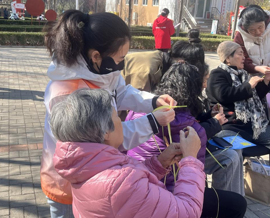 草编作为一项非物质文化遗产,不仅承载着悠久的文化底蕴,还能锻炼老人的动手能力和专注力。活动开始后,老人们在手工艺老师的耐心指导下,从选材、编织到成型逐步学习草编的基本技巧。在“一搭一绕”中老人们一步步完成了草编蚂蚱、蜻蜓。这些草编栩栩如生,充满了生命力,仿佛在老人们的手中“活”了起来。编织过程中,老人们互相交流经验,分享生活中的趣事和回忆,有的老人回忆起童年时在田间地头看到的草编玩具,有的则感叹传统手工艺的独特魅力,活动现场充满了欢声笑语。