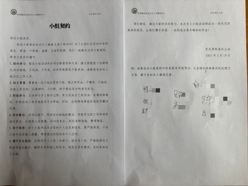 本周开展小组活动的第一节——温暖相伴·共商约定。社工首先进行自我介绍,阐述了本次小组活动的目的与意义。但参加小组活动的成员相互不熟悉,在身体状况、适应能力等方面存在着差异,因此,社工通过姓名接龙破冰游戏拉近组员之间的关系:“我叫张XX,我喜欢唱歌”,“我叫“刘XX,我喜欢看书......”有的组员害羞并不敢在小组中发言,社工便与其他组员一起给予掌声,鼓励他们勇敢表达。随后,社工小组成员共同制定一份小组契约,保证每个成员都能清楚地了解在小组活动中应遵守的规则和行为标准,并在小组契约上签字表示认可。最后,组员们进行才艺展示,每一位组员表演完毕后,其他组员们都热烈鼓掌,营造出温馨、包容的氛围,从而促进小组的和谐发展。