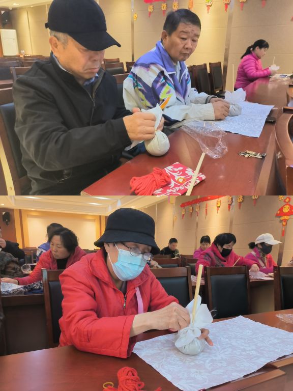 活动当天,社工们早早来到了活动现场精心准备,摆好所需要的布料、艾草包、麻绳等物料。活动开始,社工通过PPT向服务对象讲解了艾草捶的功效与使用时的注意事项。随后,又讲解了艾草捶制作时注意的要点,老人们跃跃欲试,虽然手法略显生疏,但每一个步骤都做的十分认真,在社工的协助下,一个个精美又漂亮的艾草捶逐渐成型。这些艾草捶不仅是手工制品,更凝聚了大家满满的爱心。