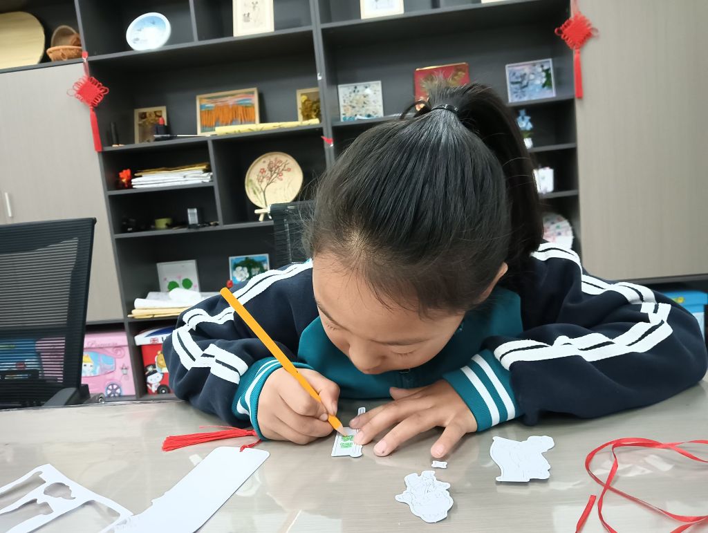 随后,社工为每位孩子分发了诗歌书签DIY材料包,鼓励大家将原创诗歌或最喜欢的诗词制作成精美的书签。孩子们纷纷展现创造力,有的以家人为主题,书写亲情的温暖;有的描绘四季变换,抒发对自然的热爱;还有的将生活感悟融入诗句,充满童真与趣味。他们执笔凝神,在纸上认真书写,用稚嫩的文字勾勒出内心斑斓的世界,用活泼的颜色增添光彩。创作过程中,孩子们时而蹙眉沉思,时而因灵感闪现而展露笑颜,现场气氛既热烈又静谧,唯有笔尖与纸张摩挲的沙沙声轻轻回荡。