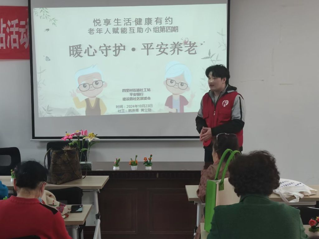 为协助老年人掌握正确的养生知识,提高自我保健能力,同时为老年人提供同辈互动平台,提高晚年生活质量和生活幸福感,10月23日,市中区四里村街道社工站联合建设路社区、平安银行,开展了“悦享生活,健康有约”长者赋能互助小组第四期:暖心守护,平安养老。