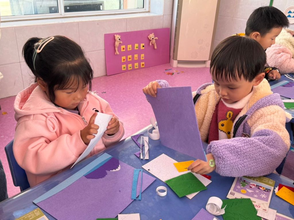 接下来的手工环节,孩子们更是热情高涨、积极性十足,在社工和老师的指导下,孩子们之间边商量边动手,你一粘、我一贴、她一拼,对比着已经完成的手工作品认真的完成着自己的作品,社工观察周围儿童的制作进度,对动手能力较弱的孩子进行鼓励和帮助,同时邀请已经完成手工的儿童互帮互助,不一会,零散的手工材料变成了一幅幅充满创意的小雪不织布画像。
