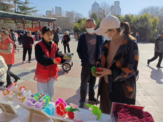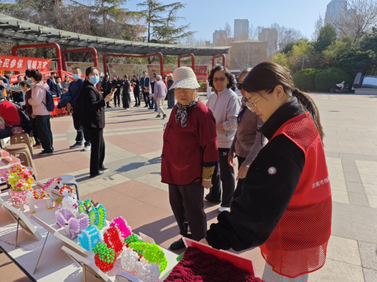 在活动现场,摊位上摆满了琳琅满目的手工作品。这些作品皆出自街道残疾人群体之手,包含精美的钻石画、独具匠心的串珠、精巧细致的手织围巾等。每一件作品都凝聚着创作者的心血与智慧,尽管他们在身体上存在一定的不便,但在创作过程中展现出的专注与执着令人动容。许多路过的居民都被这些别具一格的手工作品所吸引,纷纷驻足欣赏并购买。