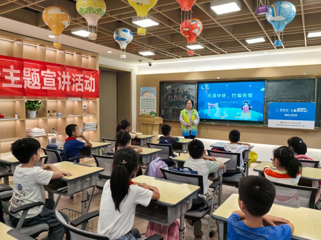 随后,社工为孩子们发放本次活动所使用的中秋主题竹编材料包,并为孩子们讲解竹编画的制作方式与技巧。在社工的耐心指导下,孩子们纷纷拿起竹条,开始尝试编织。初次接触竹编,他们虽然略显生疏,但眼神中充满了专注和认真。有的孩子创造出一轮明月,有的孩子则创造出可爱的玉兔,每一个作品都充满了童真和创意。竹编完成后,孩子们又拿起笔,写下自己对家人朋友的中秋祝福,一幅幅充满节日氛围的竹编画在孩子们的手中诞生,有嫦娥在月宫中翩翩起舞,有一家人围坐在一起品尝月饼,每一幅画都寄托着孩子们对中秋佳节的美好期待。