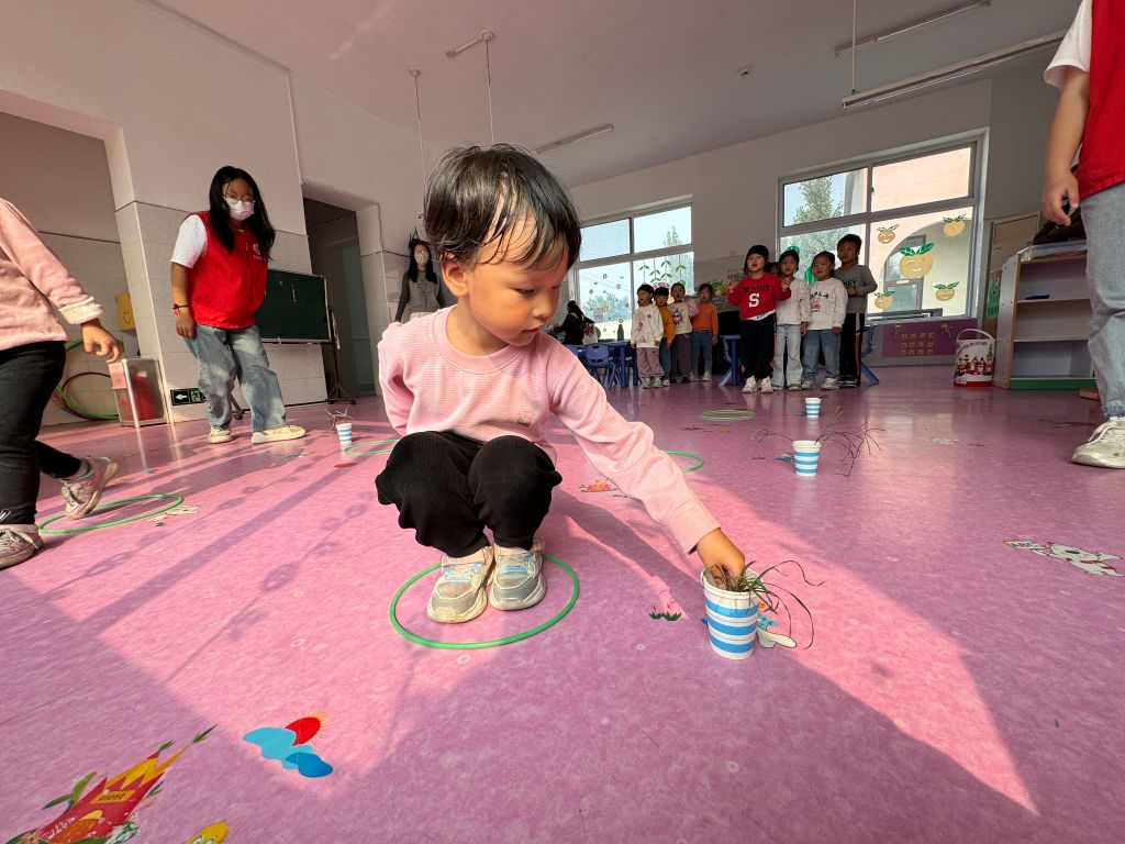 首先进行的是插秧游戏。孩子们在社工的指导下,跳进圈里,将秧苗放到纸杯中,这个过程不仅锻炼了孩子们的动手能力和下肢力量,还让他们体会到农民伯伯种植粮食的辛苦。