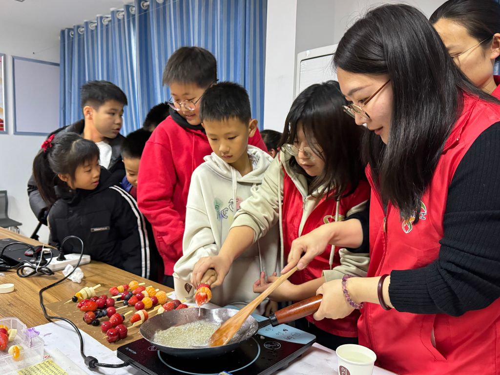 在制作环节,社工们化身为耐心的指导者。面对孩子们略显生疏的操作,社工们手把手地教他们如何串山楂、裹糖浆,时刻关注着孩子们的安全,确保每个步骤都顺利进行。孩子们在社工的鼓励下,大胆尝试,发挥创意,有的孩子还将橘子、草莓等水果与山楂巧妙搭配,制作出了独具特色的糖葫芦。