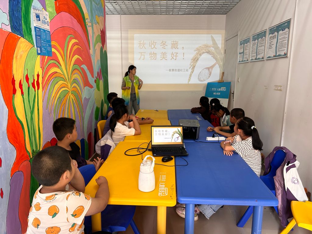 活动伊始,社工以生动的语言向孩子们科普了农作物的生长变化,从播种到收获的每一个环节都娓娓道来,让孩子们仿佛置身于金黄的麦田和稻田之中。在讲述过程中,社工特别提到了被誉为“杂交水稻之父”的袁隆平爷爷的伟大贡献,让孩子们了解到每一粒粮食背后都凝聚着无数人的辛勤汗水和智慧结晶。