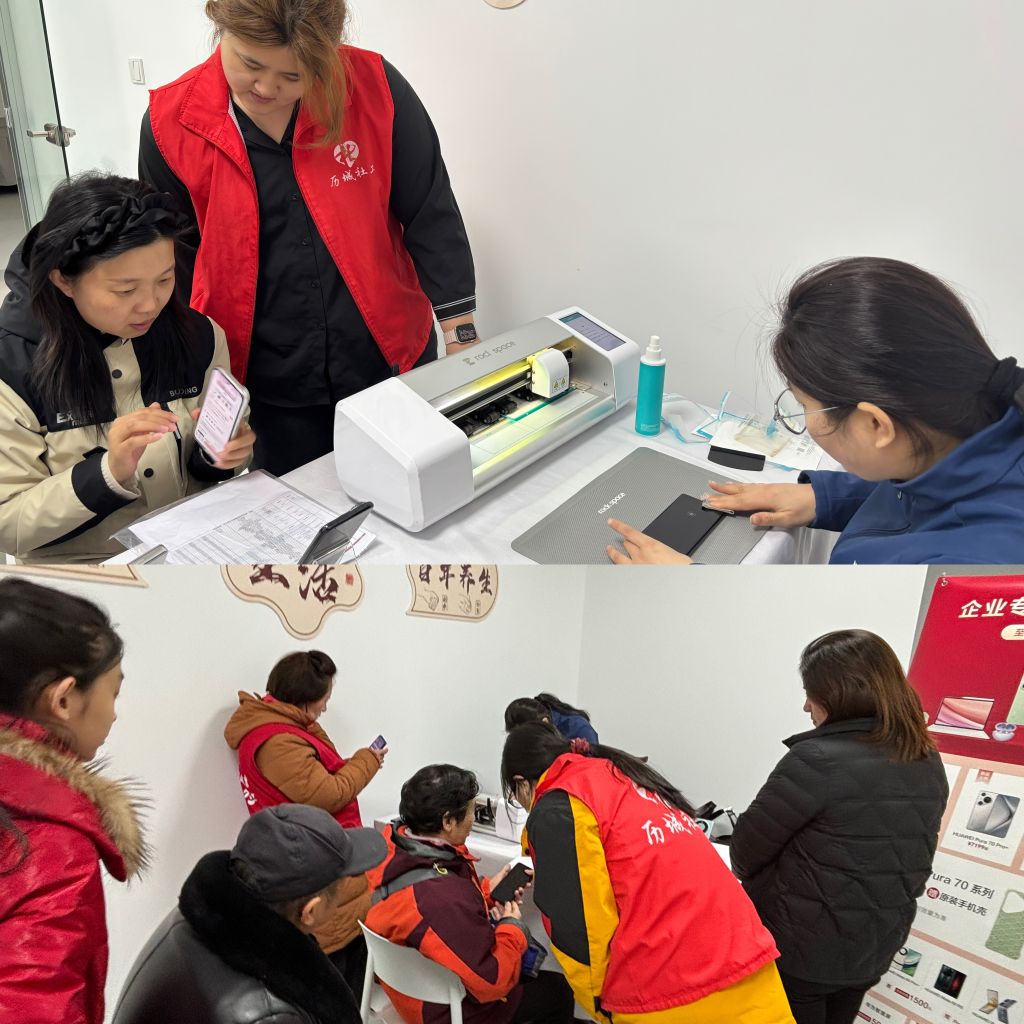 与此同时,手机贴膜活动也吸引了众多居民参与。工作人员熟练地为居民们的手机换上崭新的保护膜,解决了大家日常生活中的困扰。社工协助居民们做好登记,一起交流着使用手机的小技巧,现场气氛十分融洽。