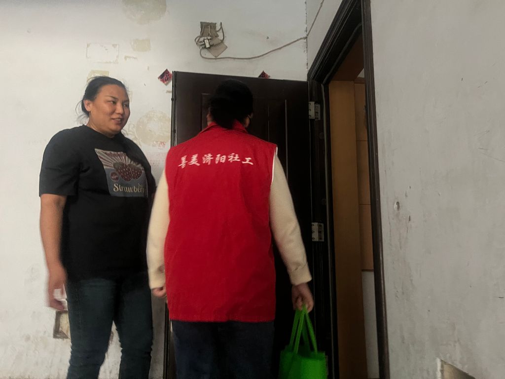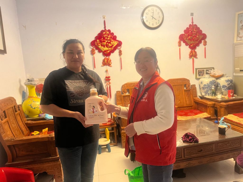 “最近天气早晚温差较大,您和家里人可得注意添衣啊。”社工每到一户,都亲切地提醒着。在走访过程中,社工了解到贾阿姨今年已经48岁,有三个儿子,两个在上学,一个智力残疾需要自己照顾,还有两个孙子需要照看,贾阿姨表示自己的身体不太好,需长期吃药,靠丈夫在外打工勉强维持生活。社工特别关注家里孩子们的健康防护问题,为他们送上了消毒洗衣液、洗手液等消护用品,耐心地向家长宣传了秋冬季常见疾病的预防知识。鼓励阿姨出门活动,与近邻多交流,积极参与社区活动。社工的这一举措得到了家长们的一致好评。