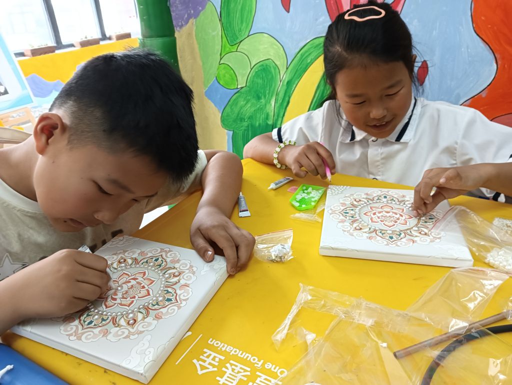 进入手工制作环节,社工为孩子们分发了非遗宋锦珍珠画DIY材料包。这些材料包中,白皙耀眼的珍珠、精致的宋锦布料以及各类制作工具一应俱全,瞬间吸引了孩子们的目光。社工深知孩子们可能对这些材料较为陌生,于是在分发材料时,一步一步耐心地演示关键制作步骤。比如,在教导孩子们如何粘贴珍珠时,社工详细展示了胶水的涂抹位置和用量,以及珍珠的排列技巧,还将复杂的制作过程拆解成“先确定图案轮廓”“再逐行粘贴珍珠”等简单小任务,分阶段指导组员完成。