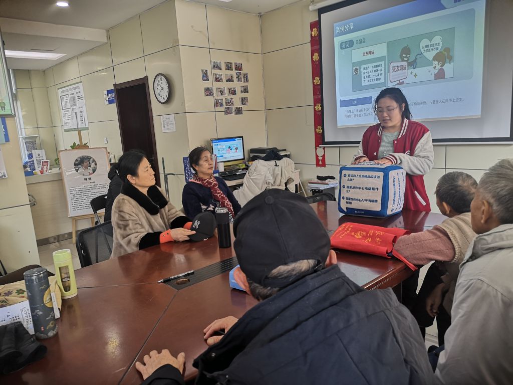 活动现场,社工结合真实案例,把现场老人带入到情景中,直面诈骗分子的层层套路,深入浅出地分析了当前常见的诈骗手段,如虚假投资理财诈骗、以房养老诈骗、杀猪盘诈骗等,并有针对性地进行了防范诈骗的方法和技巧方面的讲解。