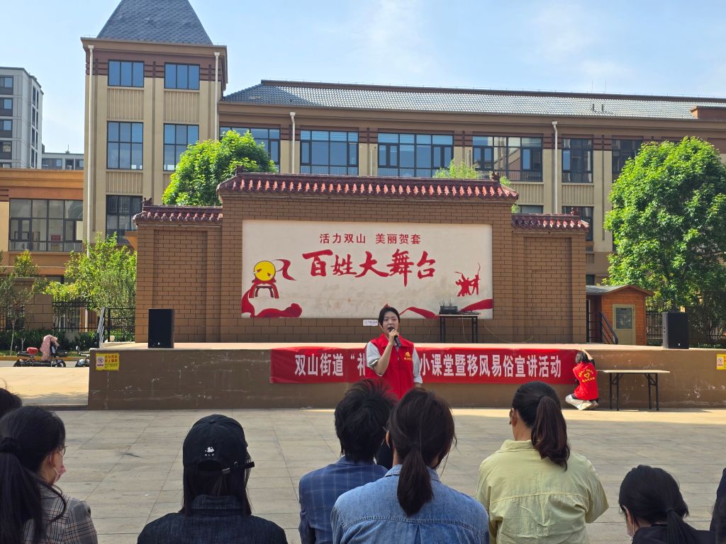 为深入推进移风易俗工作,培育文明新风尚,4月23日上午,双山街道社工站联合双山街道办事处、贺套村委在贺套文化广场开展了一场别开生面的移风易俗主题宣传活动。活动通过“宣讲+文艺”的多元形式,吸引了众多村民热情参与。